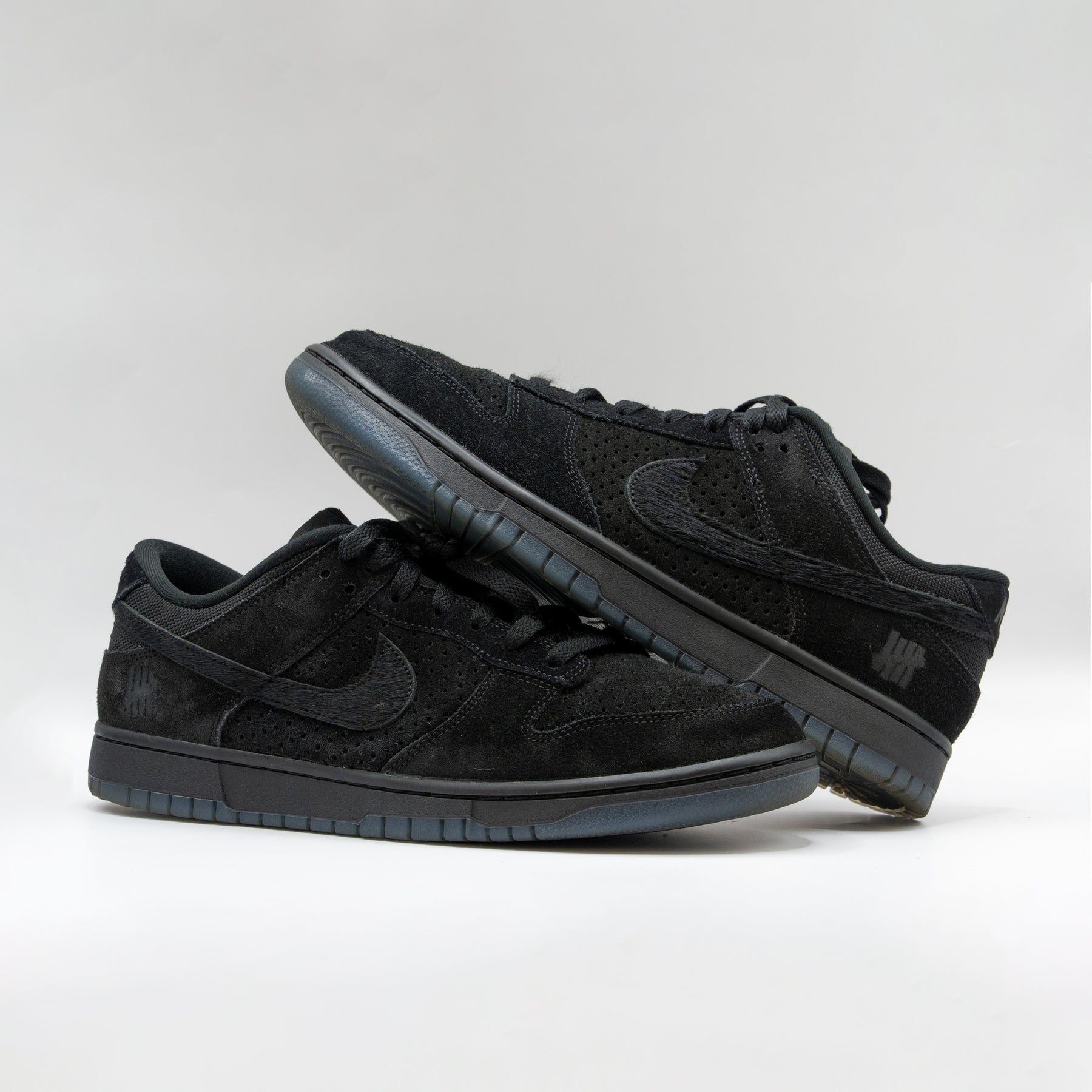Launching as the third installment in the LA retailer’s ‘Dunk vs AF-1’ series, this triple-black edition of the Nike Dunk Low features an eclectic mix of materials throughout the upper. Perforated suede on the toe box and quarter panel is overlaid with smooth suede paneling along the forefoot and heel. The Swoosh is covered in pony hair, while the collar and tongue are crafted from mesh and nylon, respectively. Undefeated’s Five Strikes logo appears on the woven tongue tag and lateral heel. The sneaker is mounted on a matching black midsole, supported underfoot by a translucent rubber outsole.